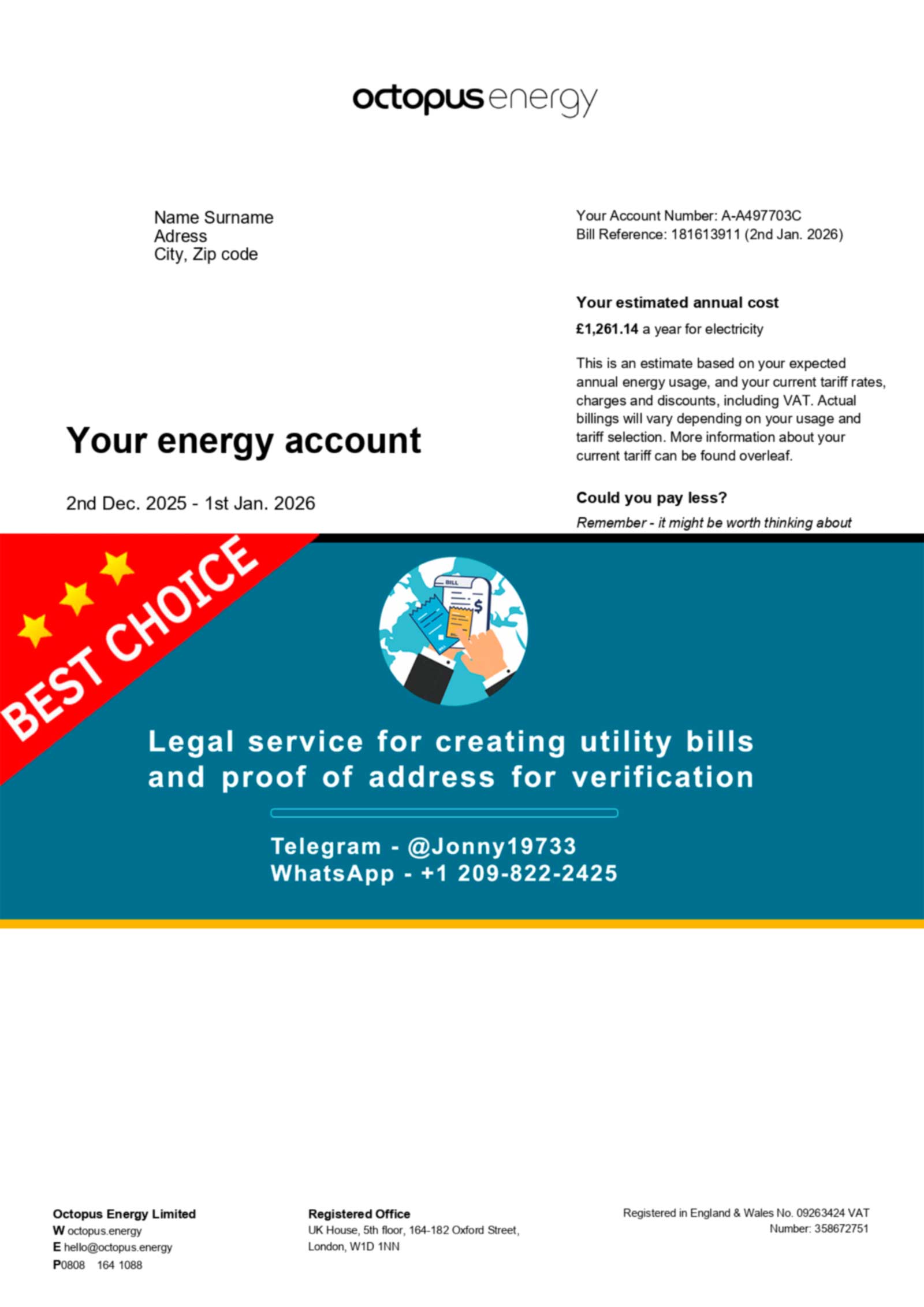 This page may reference an Octopus Energy utility bill template as a visual layout example to illustrate where key details are typically placed.