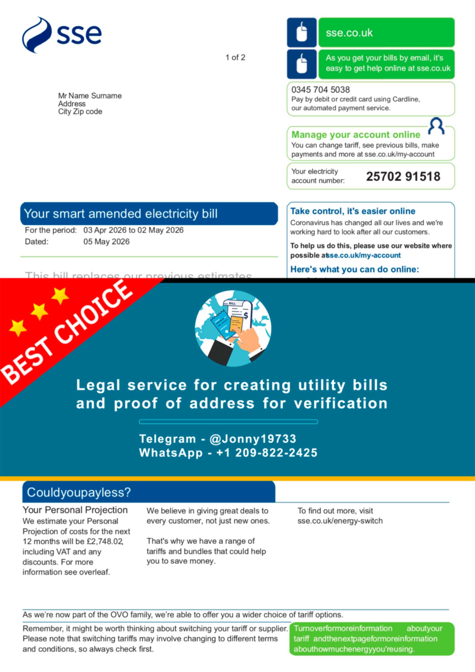 SSE Energy is a long-established UK electricity and gas supplier with a large residential customer base. This page explains the format and visual structure of an SSE Energy utility bill and how it is commonly reviewed as an informational reference for proof of address in the United Kingdom, depending on platform-specific requirements.