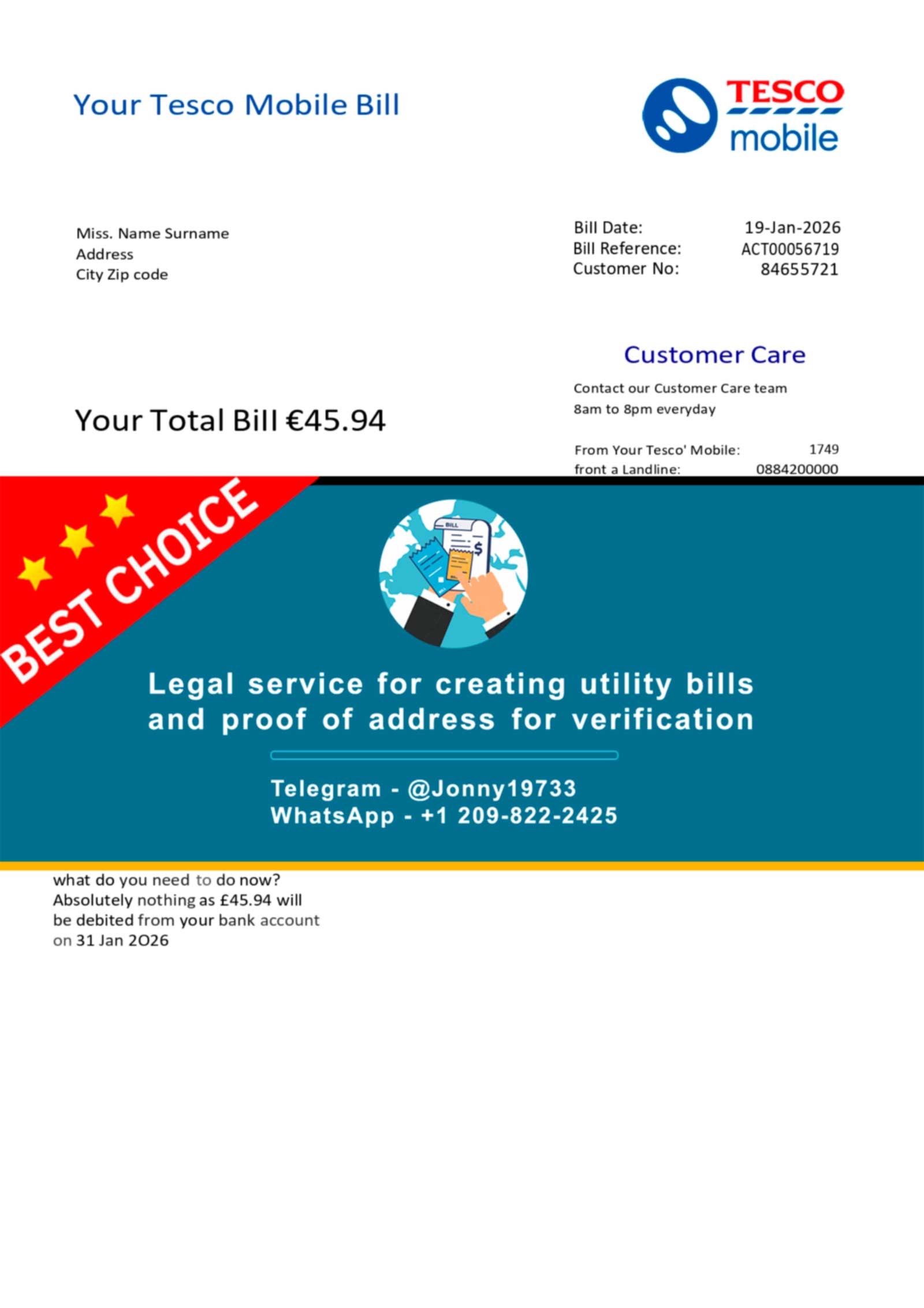 Tesco Mobile is a UK mobile network operator offering SIM-only and handset plans, with billing issued primarily as digital monthly statements. This page explains the format and visual structure of a Tesco Mobile bill and how it is commonly reviewed as an informational reference for proof of address in the United Kingdom, depending on platform-specific requirements.