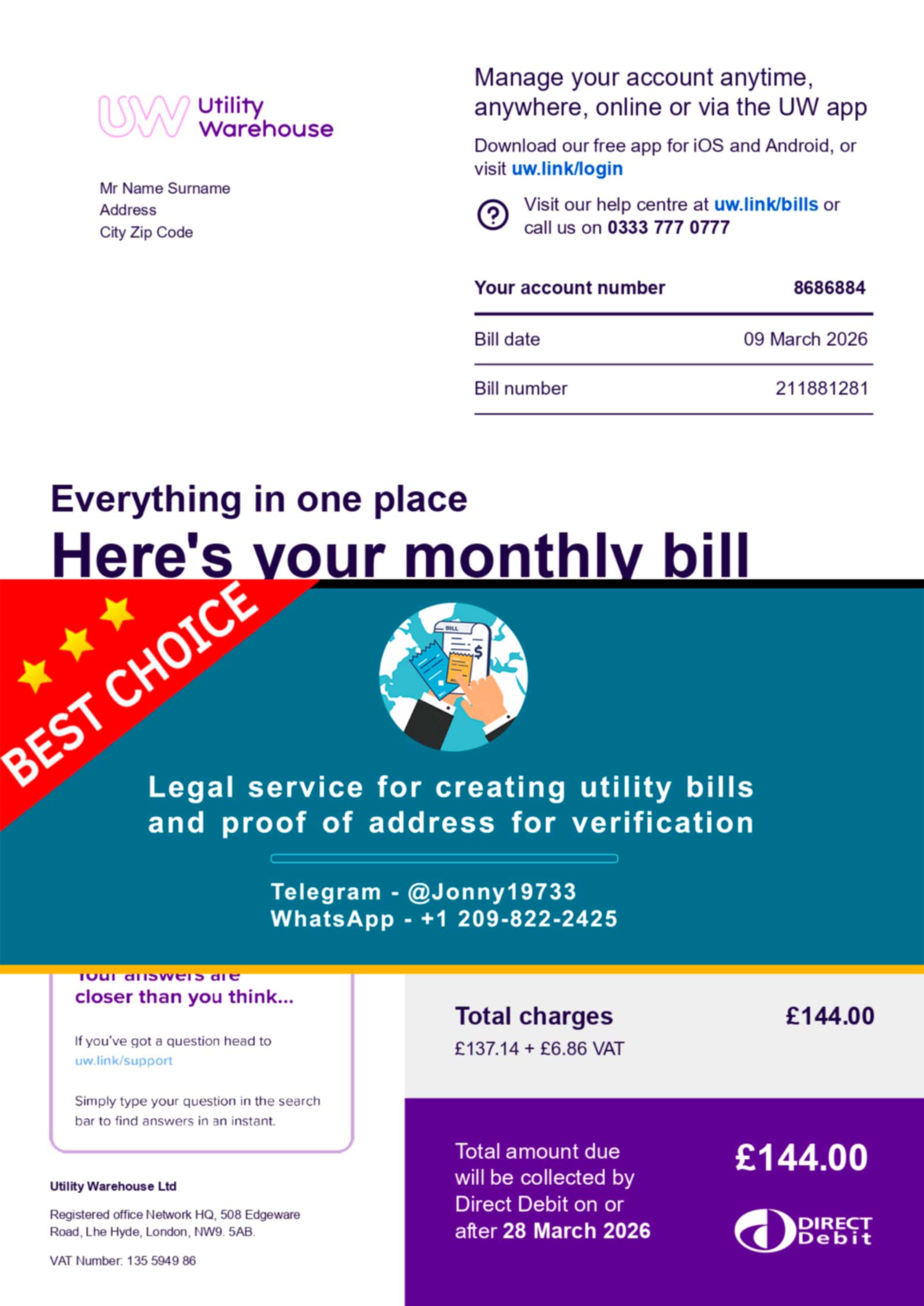Utility Warehouse is a UK provider offering bundled household services such as electricity, gas, broadband, mobile, and insurance under a single account. This page explains the format and visual structure of a Utility Warehouse bill and how it is commonly reviewed as an informational reference for proof of address in the United Kingdom, subject to platform-specific requirements.
