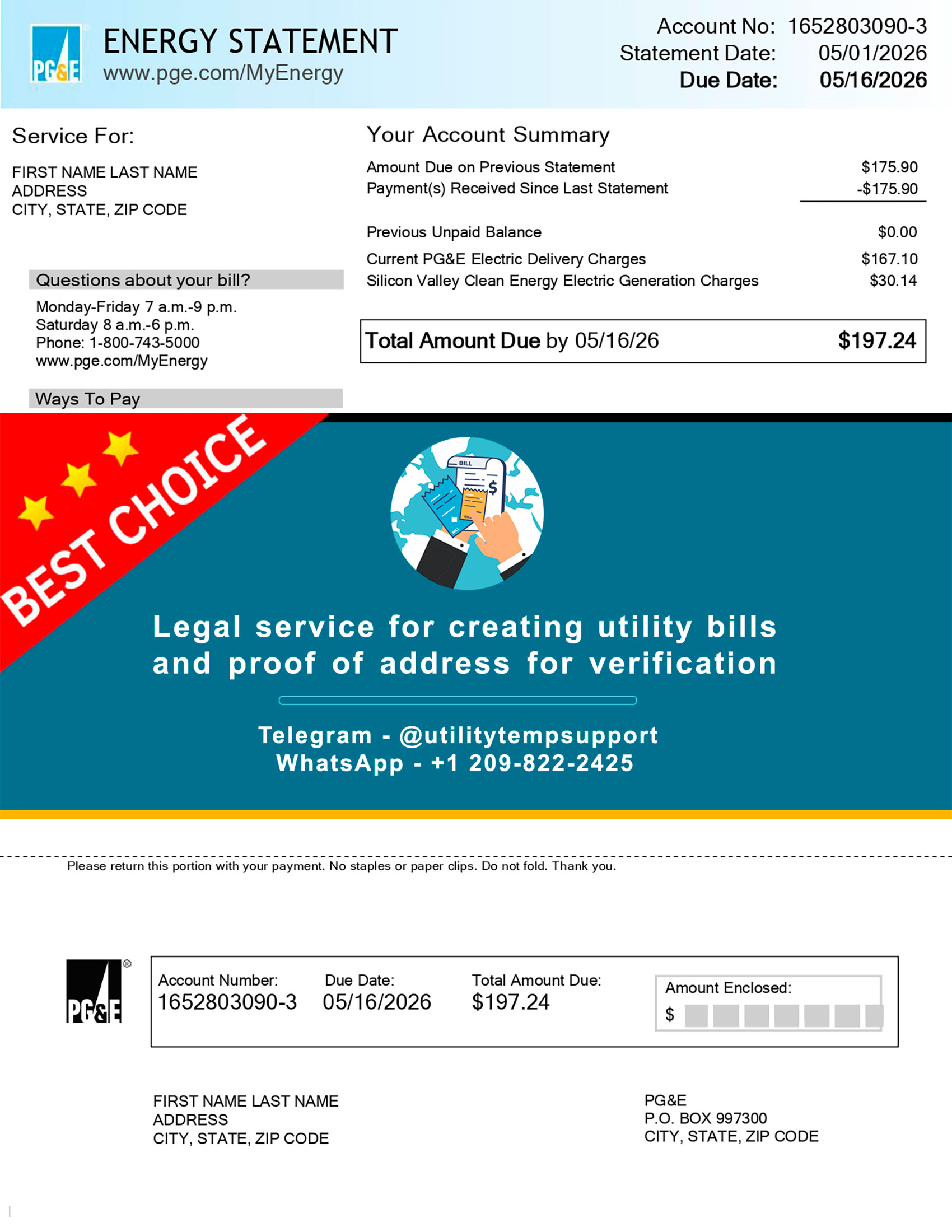 PG&E Utility Bill Format for Proof of Address Fake Utility bill