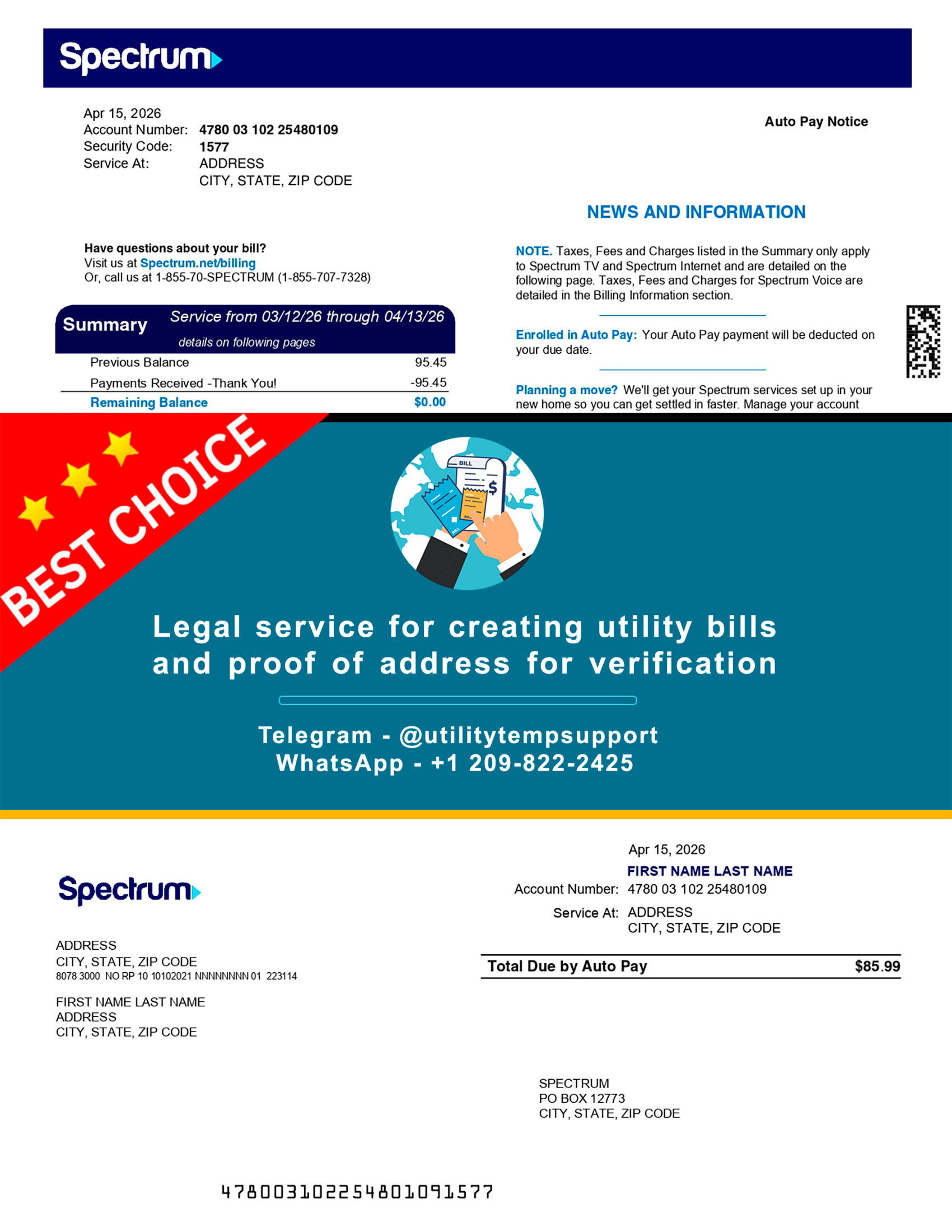 If you are exploring document layout references for a Spectrum utility bill, available options focus on visual structure, field placement, and formatting clarity. Delivered formats include JPEG or PDF + JPEG, with delivery based on the selected package.