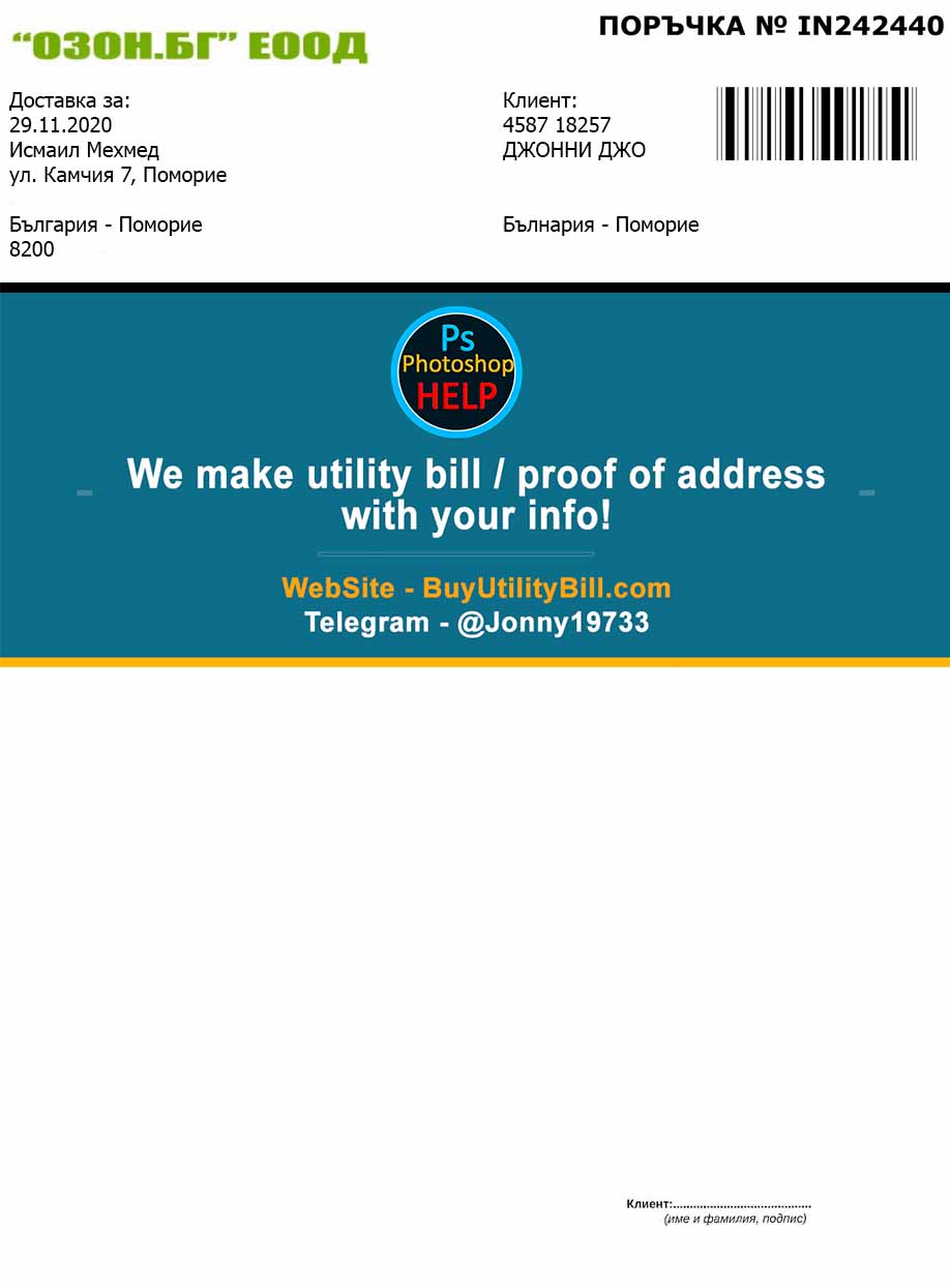All sample pictures on this site are for convenience only so that you can choose the company you want to cooperate with. For example: Bulgaria Postal utility bill template We have on our website authorized companies that cooperate with us and that can legally provide you with a utility bill with the necessary data and address.