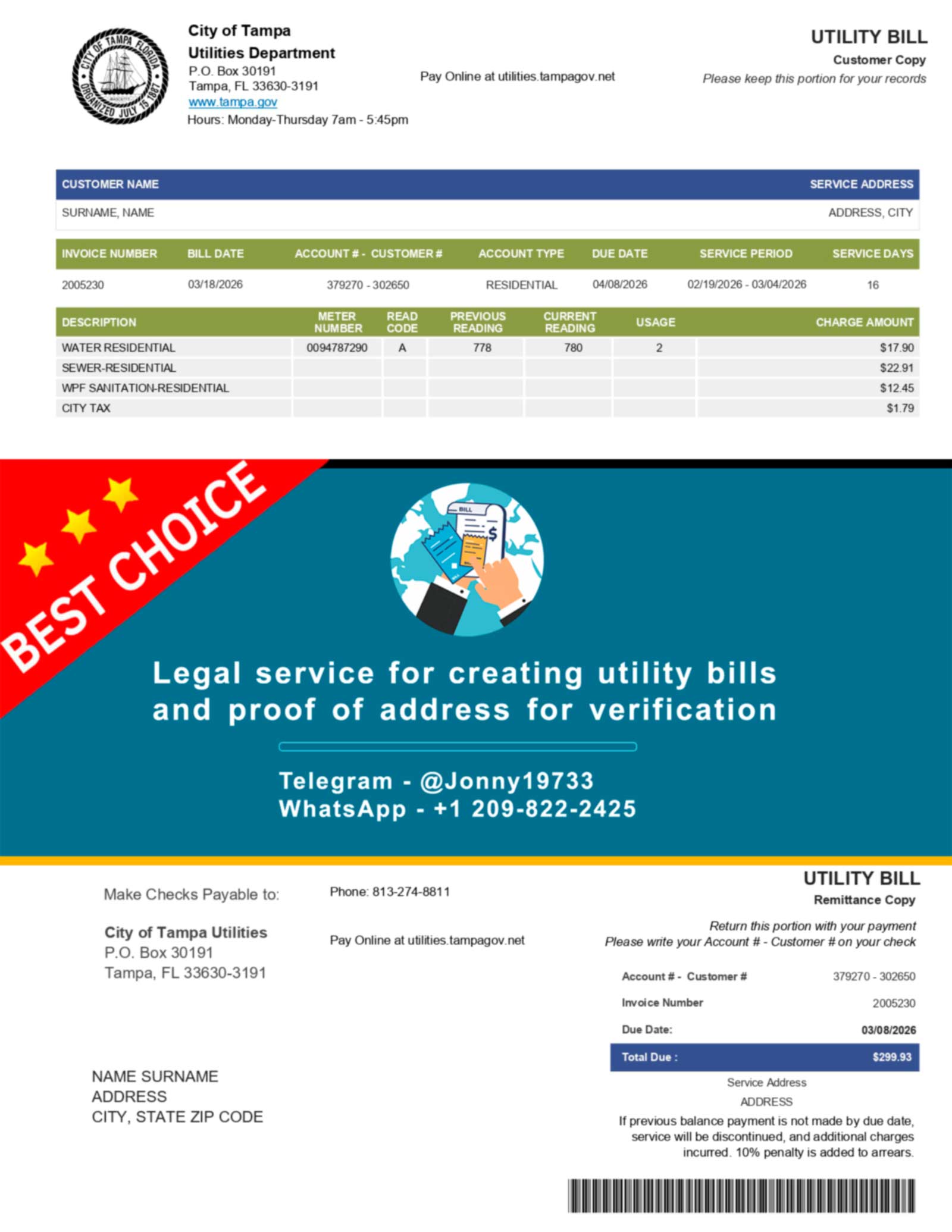 This service provides document preparation assistance and a utility bill template inspired by City of Tampa municipal utility billing, commonly used for proof of address verification in Tampa, Florida.