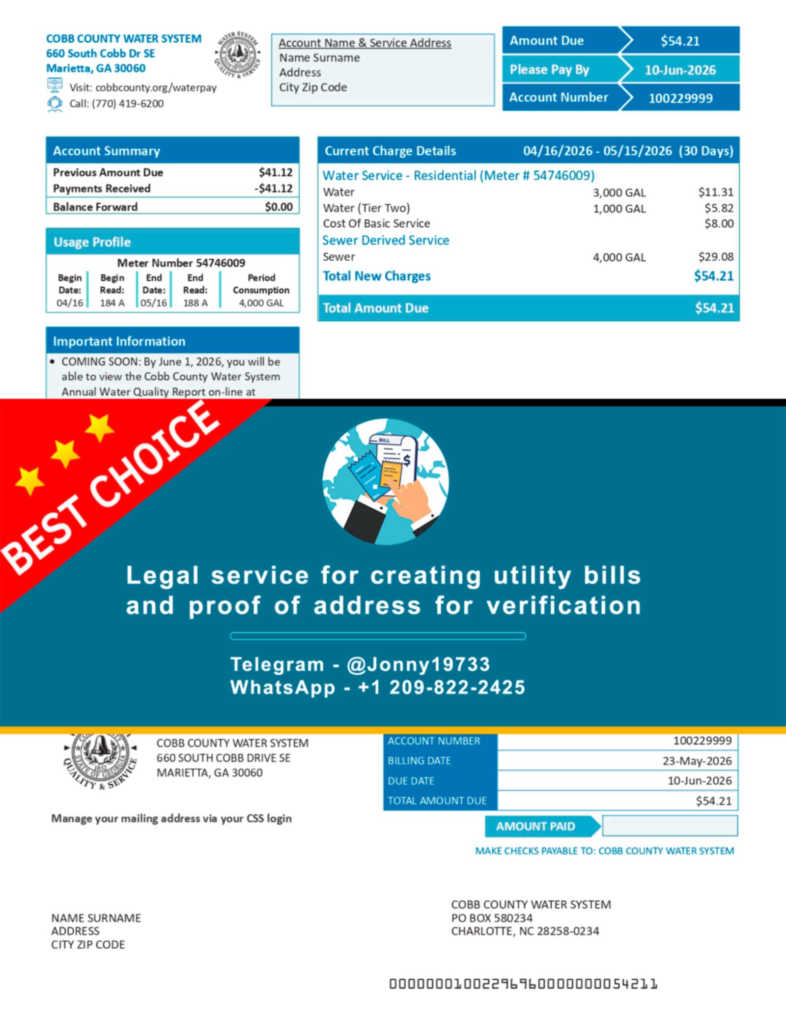 This service provides document preparation assistance and a utility bill template modeled after Cobb County Water System billing statements, commonly used for proof of address verification in Georgia.