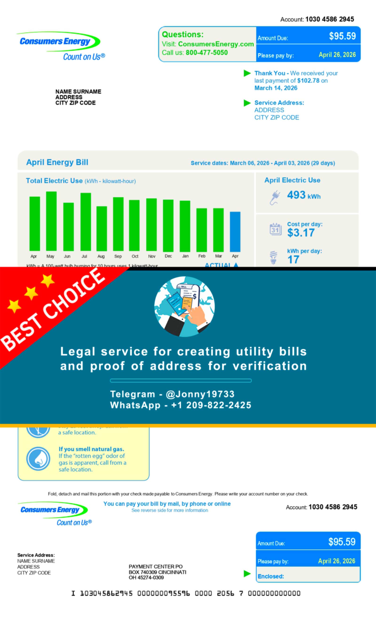 This service provides document preparation assistance and a utility bill template inspired by Consumers Energy billing statements, a statewide regulated utility serving Michigan households with electricity and natural gas services.